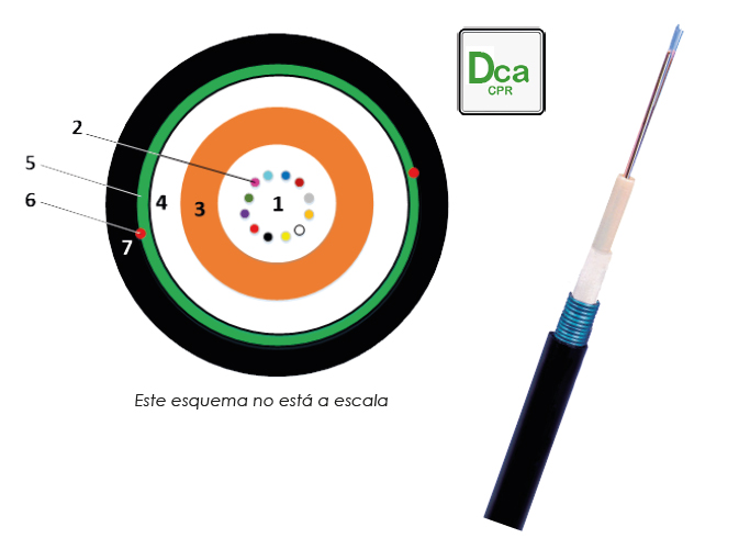 Cable de fibra óptica en estructura holgada formado por un tubo relleno de gel hidrófugo (anti-humedad) que permite incluir en su interior 24 fibras ópticas. El núcleo óptico se protege con refuerzo de fibra de vidrio compactada que contribuye a la robustez del cable y le confiere cierta resistencia contra los roedores. Su estructura es totalmente dieléctrica (sin componentes metálicos) que le da una gran facilidad de manipulación y manejo. Las fibras ópticas de su interior van coloreadas para su fácil identificación. Está fabricado y testeado bajo las especificaciones de estanqueidad IEC 60794.