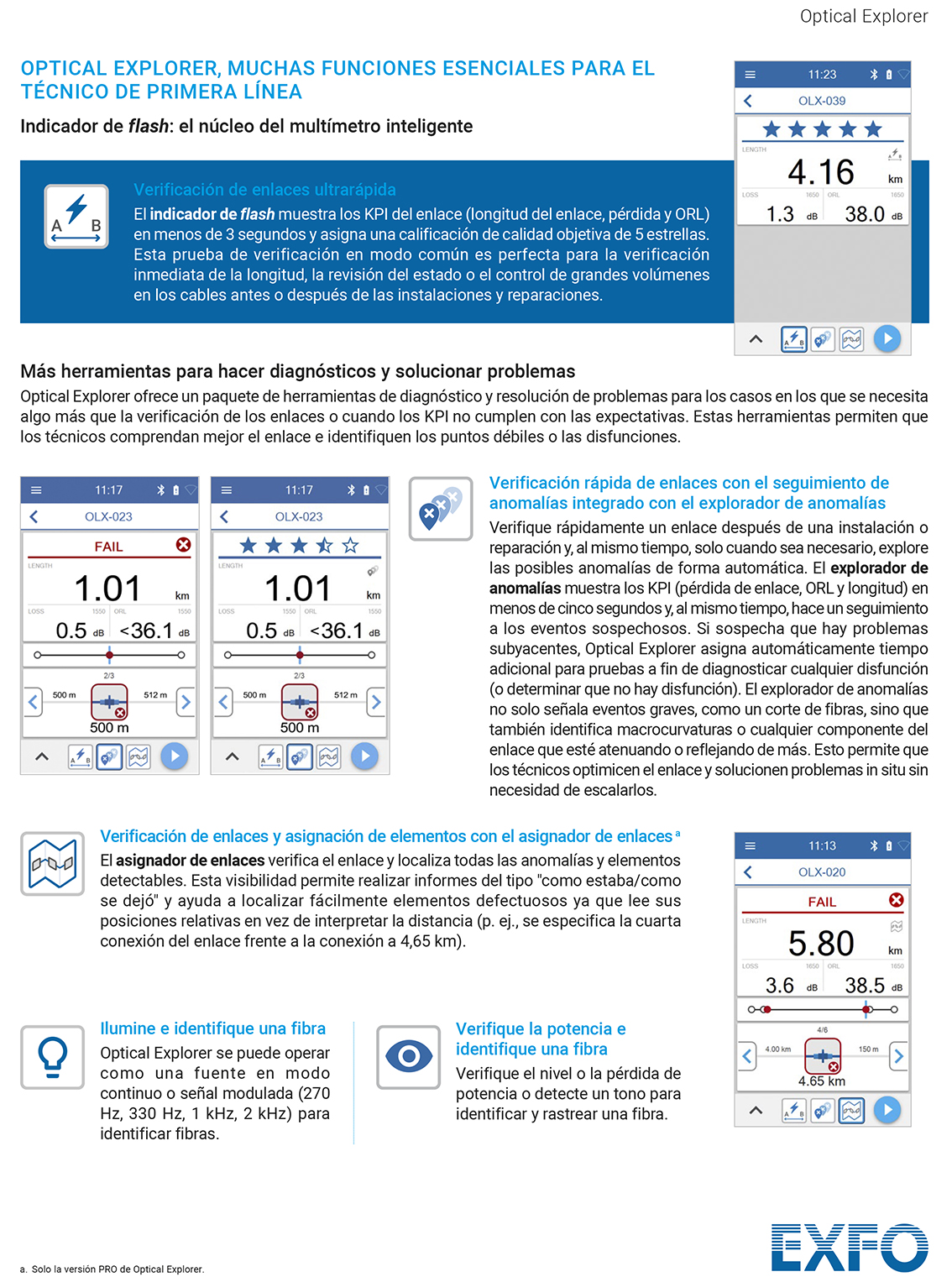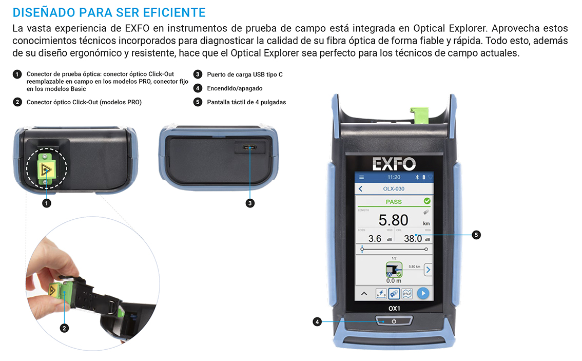 El Optical Explorer es algo más que una herramienta de medida, ya que proporciona un enfoque completamente nuevo a las tareas de instalación y reparación de fibra. Esta solución intuitiva garantiza mayor eficiencia en la operación y asegura la calidad de la red, minimizando los retardos y costes asociados a la aparición de problemas.