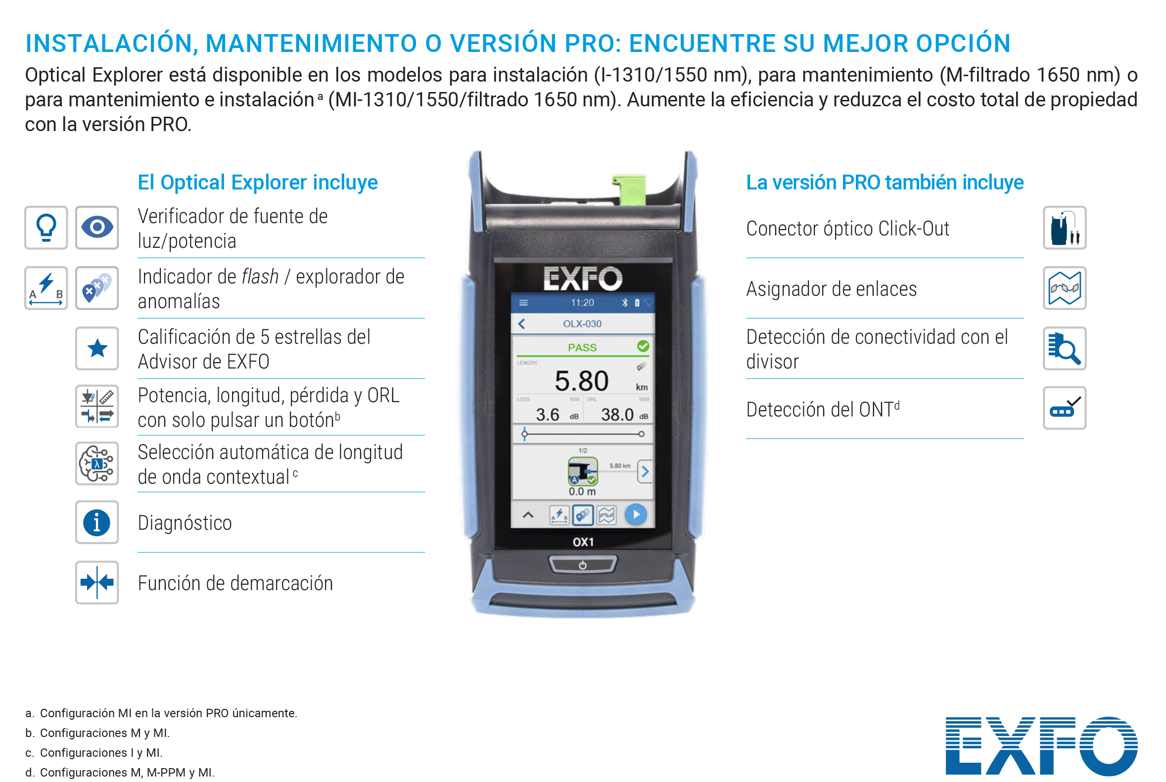 El Optical Explorer ayuda a reducir el coste total de mantenimiento mediante una calibración de por vida y unos conectores ópticos Click-Out patentados, ahorra tiempo al explorar sólo los enlaces defectuosos (o sospechosos de fallo) y valida la calidad del enlace en segundos, asignando una ratio de una a cinco estrellas (con la función Advisor y mediante algoritmos sofisticados tras apretar un botón).