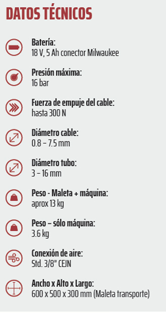 Máquina para soplado de cable de fibra, de funcionamiento por batería, extremadamente compacta, optimizada para instalaciones FTTX de cables de fibra soplada (EPFU) y micro/nano cables de fibra de entre 0,8 y 7,5 mm de diámetro, en tubos de entre 3 y 16 mm de diámetro exterior.